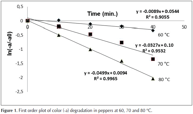 The peppers fruit used in the research had a pH (5.73±0.25), titratable acidity (0.10±0.005 g citric acid 100 g-1 pulp), soluble solids (4.70±0.28), and color parameters L=38.20±0.60, -a=13.18±1.37 and b=13.40±3.08. Using linear regression, the degradation data were analyzed using Eq. (4) to determine the overall order and rate constant for the degradation reaction. Accordingly, ln(-a/-a0) was plotted vs t, from which rate constant, k was calculated as the slope Fig. 1 shows the representative values for the first order plots for the degradation of greenness (-a value) for peppers at 60, 70 and 80 °C, respectively. The rate constants determined from the slopes of the regression lines are presented in Table 1, a correlation coefficient >0.9 in all cases confirmed that the degradation of visual green color in peppers indeed follows a first order reaction at all temperatures.