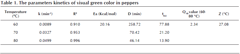 Our results, the rate constants determined, are consistent with those obtained by other studies to evaluate of visual green color in spinach (Nisha et al. 2004) and green peas (Koca et al. 2006) after thermal treatments. Previous studies have reported wide variation in the activation energies for color degradation of green vegetable. Activation energies for color degradation in peas (Steet and Tong 1996), green chilli (Ahmed et al. 2002), coriander leaf (Ahmed et al. 2004), spinach (Nisha et al. 2004), and green peas (Koca et al. 2006) are reported to be 18.2 (range of 70-90 °C), 5.50 (range of 50-90 °C), 7.00 (range of 50-110 °C), 8.95 (range of 50-120 °C), and 11.90 (range of 70-100 °C) Kcal/mol, respectively. These variations may be attributed to the differences in the raw material and the temperature ranges used in these studies. The value of activation energy obtained in the present investigation, evidence that there is a loss of surface color of green pepper samples treated in the temperature range of 60-80 °C, and this reduction of color, it is probably due to the irreversible rupture chlorophyll a and b in major derivatives pheophytin a and b (Martínez-Hernández et al., 2013 and Martínez et al., 2013). These results may be useful for designing new thermal processes to preserve surface color or implement quality control systems for the heat treatment as is discussed by Xiao et al. (2014).