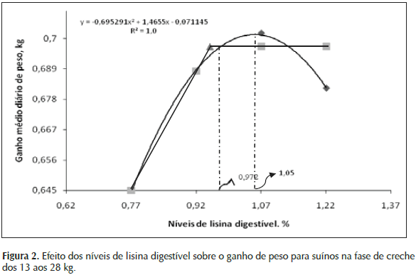 Para máximo ganho de peso diário o nível de lisina digestível pelo modelo quadrático foi estimado em 1.05% (Figura 2), e pelo modelo Linear Response Plateau, LRP, como 0.95%. Para esta faixa de peso, pela interseção das curvas (Figura 2) dos dois modelos estimou-se a exigência de lisina digestível em 0.972%, o que corresponde a um consumo de 14 gramas/dia de lisina digestível. Este valor é menor que a exigência preconizada por Rostagno et al. (2011) que é de 1.037% para suínos machos castrados de alto potencial genético com desempenho médio na faixa de peso 15-30 kg; e menor aos valores estimados por Rossoni et al. (2009) de 1.08% para fêmeas selecionadas para deposição de carne magra.