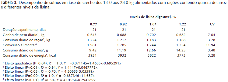 Os resultados de desempenho de suínos na fase de creche nas faixas de peso 6-13 e 13-28 kg, e alimentados com rações que contendo quirera de arroz com diferentes níveis de lisina, são próximos aos resultados onde utilizaram rações baseadas em milho como principal constituinte da dieta (Moreira et al., 2005; Nunes et al., 2008; Zangeronimo et al., 2007).