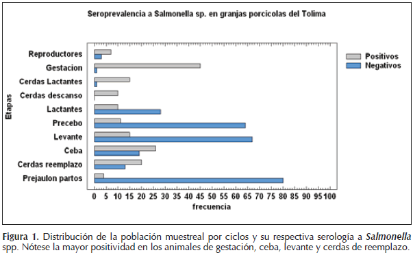 El análisis estadístico comprendió una evaluación descriptiva de los datos, la determinación de la seroprevalencia, así como un prueba de Chi cuadrado (x2) para establecer la correlación existente entre el ciclo de los animales muestreados y la seropositividad a Salmonella spp. Los ciclos fueron categorizados de la siguiente manera: ciclo 1=reproductores; 2=gestación; 3=cerdas lactantes; 4=cerdas descanso; 5=lactantes; 6=precebo; 7=levante; 8=ceba; 9=cerdas reemplazo; 11=prejaulón partos. Los datos fueron analizados estadísticamente mediante el uso del software estadístico SAS versión 8.0 para Windows (SAS, USA) y graficados a través de Stat graphics Centurion XV versión 15.2.05 para Windows (©StatPoint, Inc, 2007).