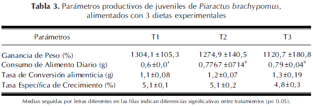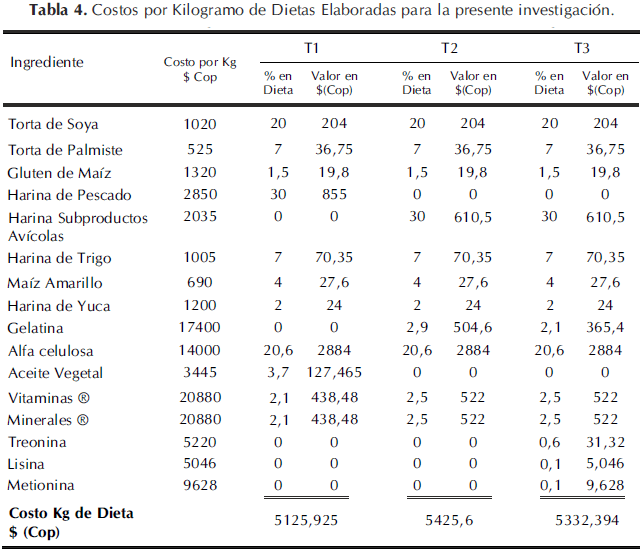 En la tabla 4 se presentan los costos de las materias primas usadas para las dietas experimentales (estos datos están basados en cotizaciones de empresas comerciales en fechas correspondientes a la presentación del presente artículo). El menor costo se presenta en T1 (100%), como se observa en la tabla 4, seguido de T3 y T2. En T3, se incrementa el valor en un 4%; y para T2, este aumento es del 5,8%.