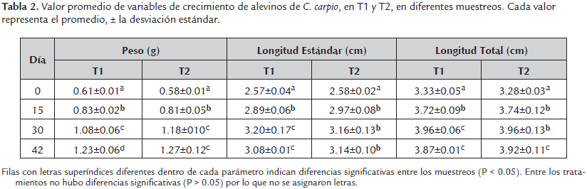 Para el crecimiento de C. carpio, el peso promedio (tabla 2) del T1 presentó diferencias significativas (P < 0.05) durante los cuatro muestreos realizados. Mientras que el T2 mostró un aumento significativo (P < 0.05) entre los tres primeros muestreos correspondientes a los días 0, 15 y 30, pero no hubo diferencias (P > 0.05) entre el día 30 y el día 42. Diferencias significativas (P < 0.05) en longitud estándar y total (tabla 2) se obtuvieron entre los días 0, 15 y 30, pero los datos obtenidos en el día 42 son iguales a los del día 30. Sin embargo, el T2 mostró diferencias significativas (P < 0.05) entre los dos primeros muestreos, pero los últimos tres son estadísticamente iguales (P > 0.05). Además, el crecimiento de los individuos fue similar (P > 0.05) entre los tratamientos.