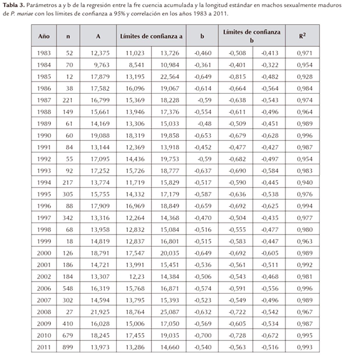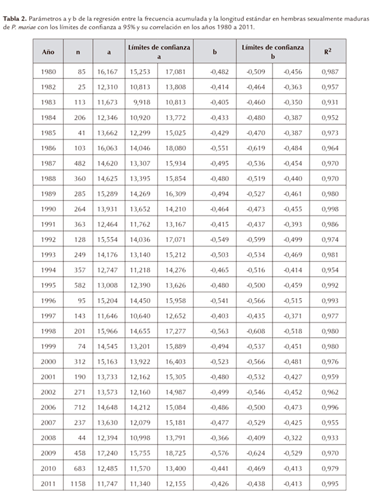 Fase de campo Los registros de tallas de captura de P. mariae fueron recopilados mediante muestreos a los desembarcos; de 1980 a 1986 se realizó un muestreo mensual y de 1987 a 2002 se incrementó el esfuerzo a cuatro monitoreos mensuales, la fecha de los muestreos se seleccionó de manera aleatoria; entre los años 2006 a 2011 el muestreo fue diario. Sin información para los años 2003-2005.